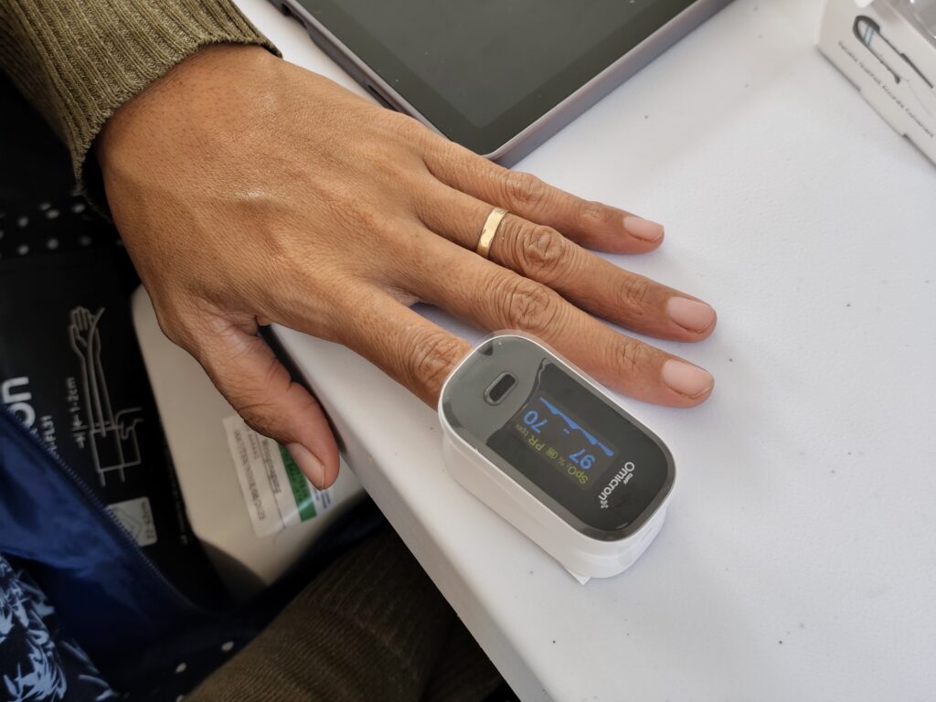 Siangnya, suasana semakin dinamis. Para kader mempraktikkan pengukuran tekanan darah menggunakan perangkat digital OMRON, mulai dari pemasangan baterai hingga teknik penggunaan yang tepat. Tidak berhenti di situ, mereka juga belajar mengukur laju pernapasan dan kadar oksigen dalam darah menggunakan oksimeter, serta mencatat hasilnya secara sistematis.